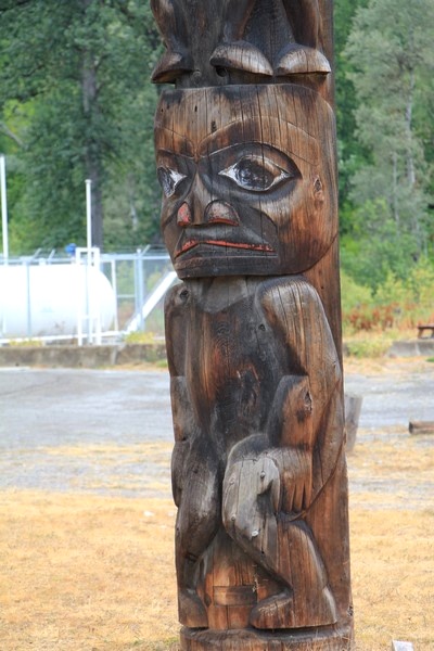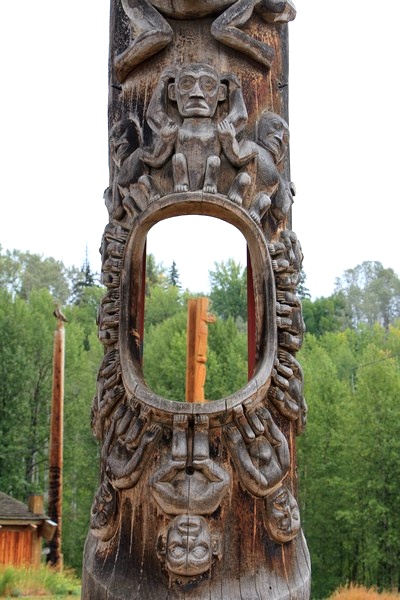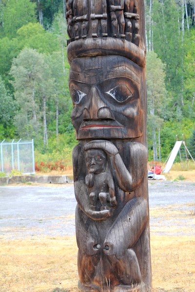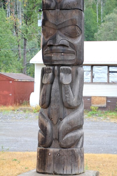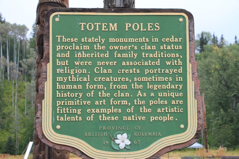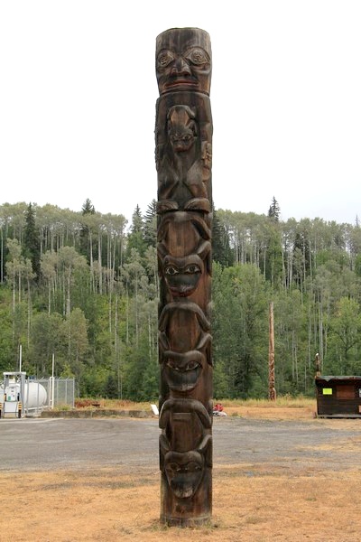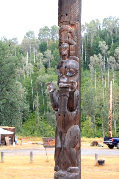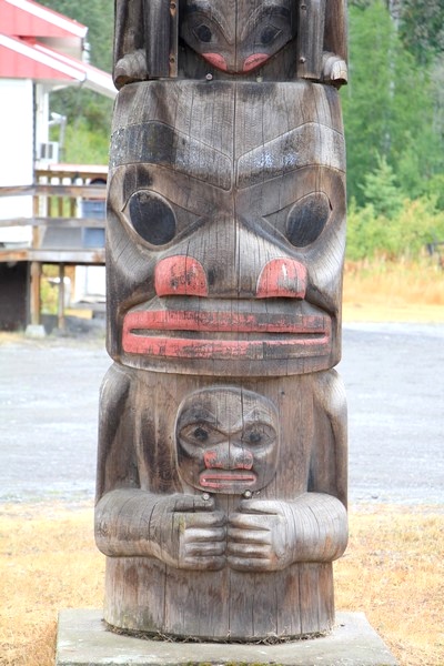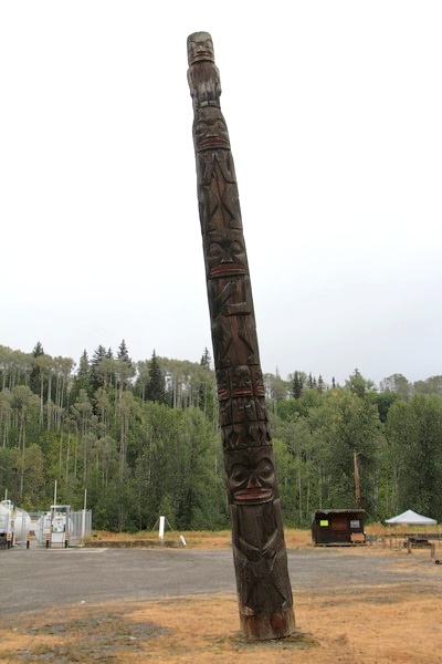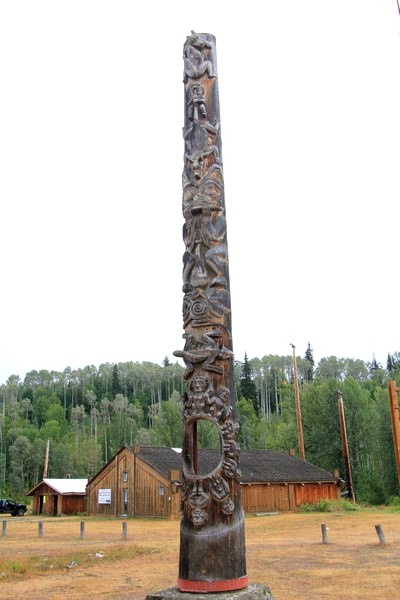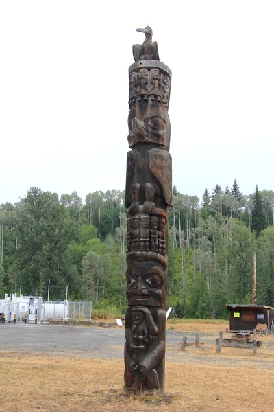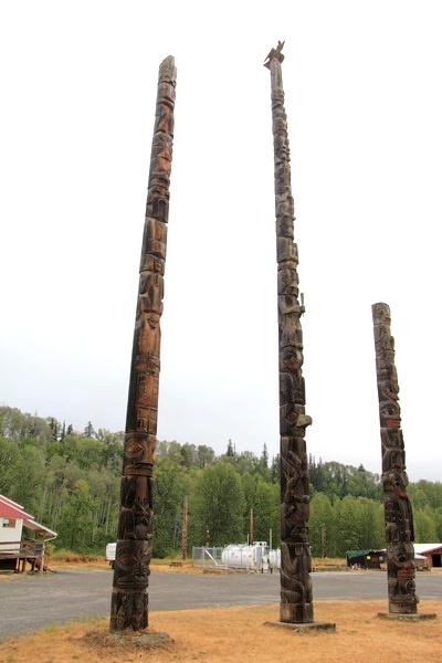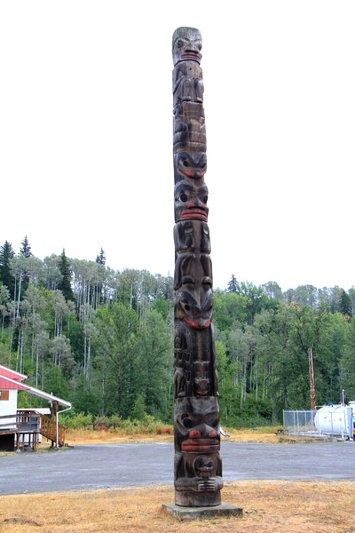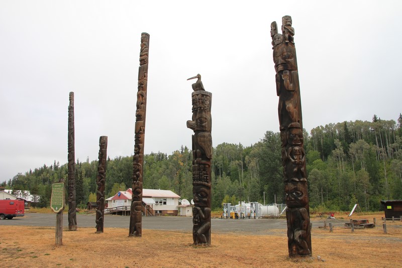 La veille, nous avons dit au revoir à nos amis Nisga'a en les remerciant de leur accueil chaleureux. Ils nous ont parlé de leur village Gitanyow (ou Kitwancool en anglais) et des Totem Poles créés par leurs artistes (55.265355,-128.06433). Alors, on passe y faire un tour en chemin.