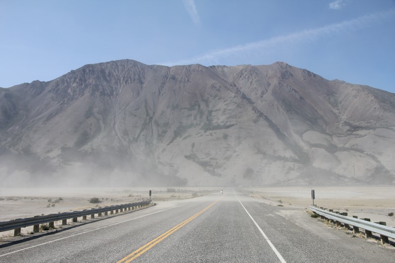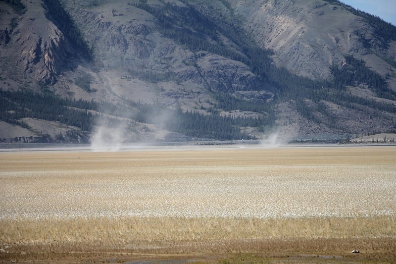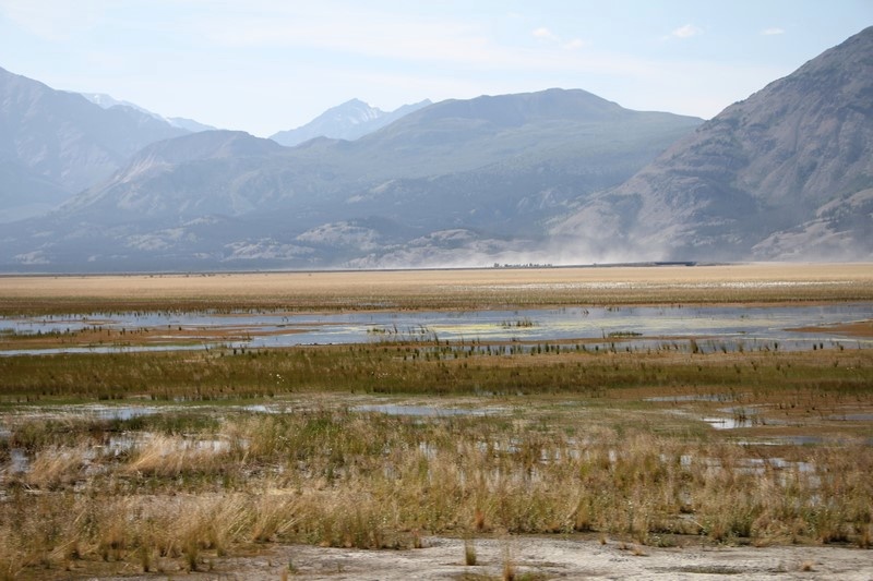 Le vent souffle fort et chaud. On est étonnés de voir des tornades et des nuages de poussière en arrivant. On apprendra plus tard que la zone humide sur laquelle on est s'est asséchée en l'espace de quelques semaines il y a deux ans. Le niveau d'eau a perdu 3m car la grande partie des 80% d'eaux du glacier qui alimentaient la rivière se jettant dans le lac ont été déviés vers la seconde vallée que le glacier alimente, résultat des formations rocheuses mises en mouvement par le glacier qui ont formé un barrage naturel.