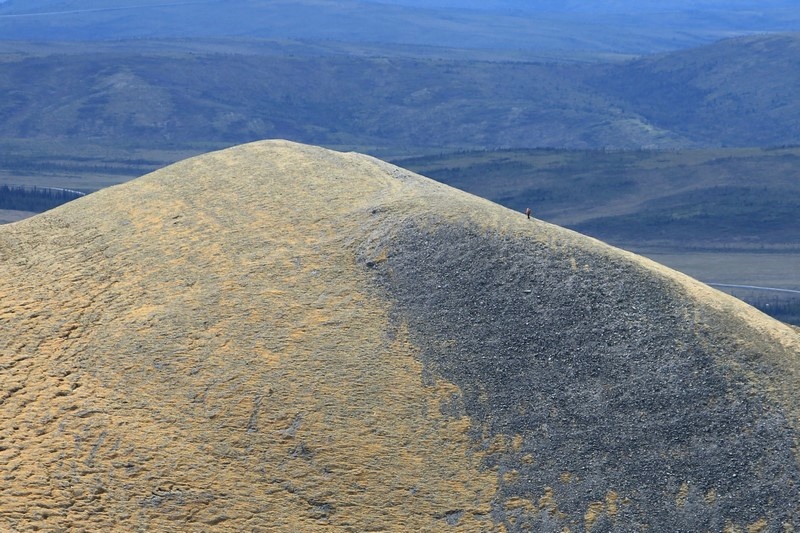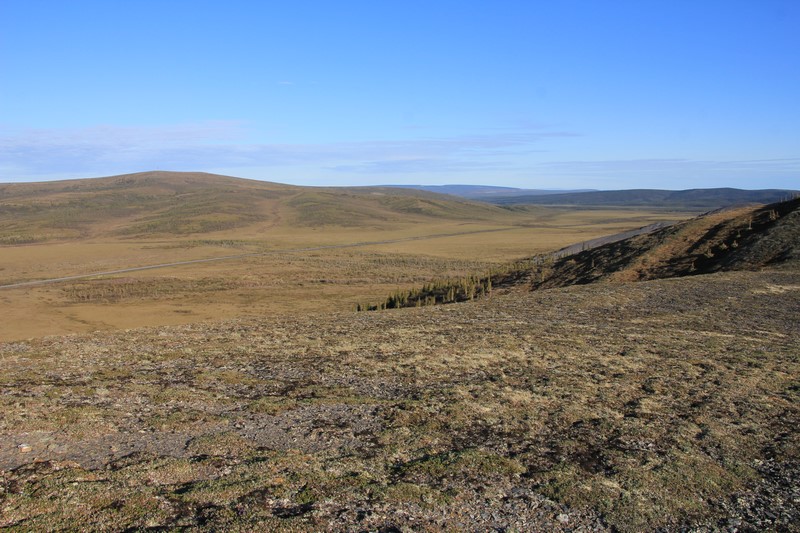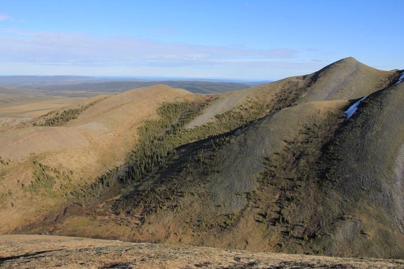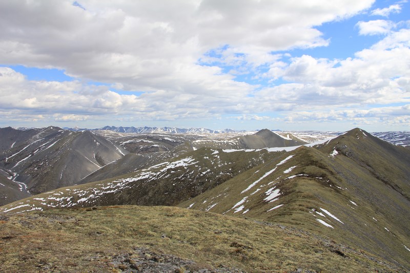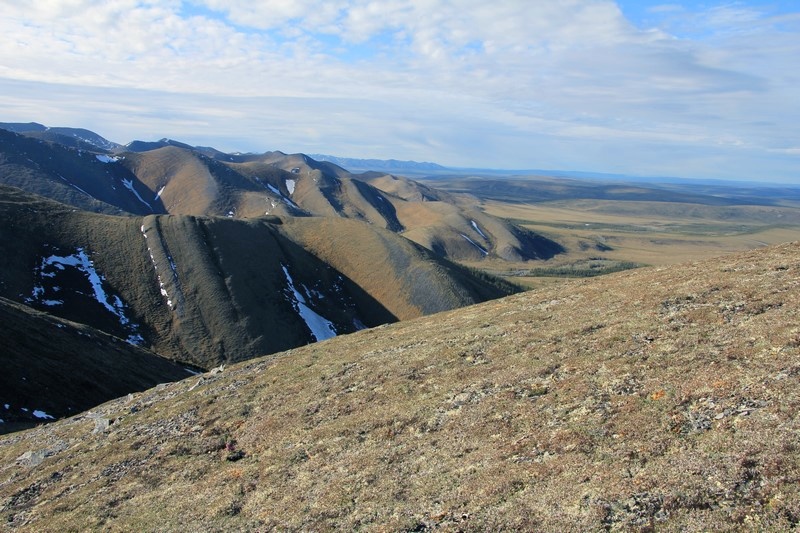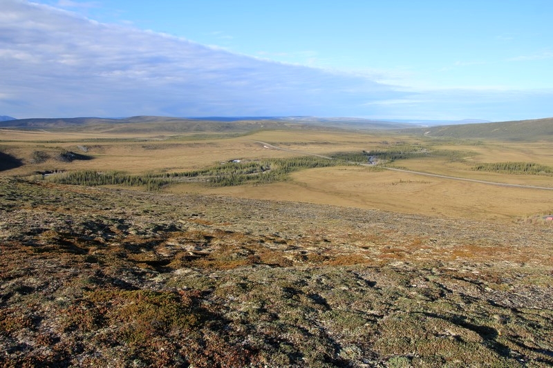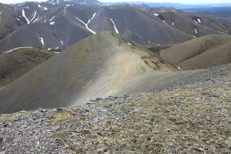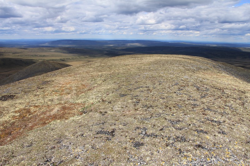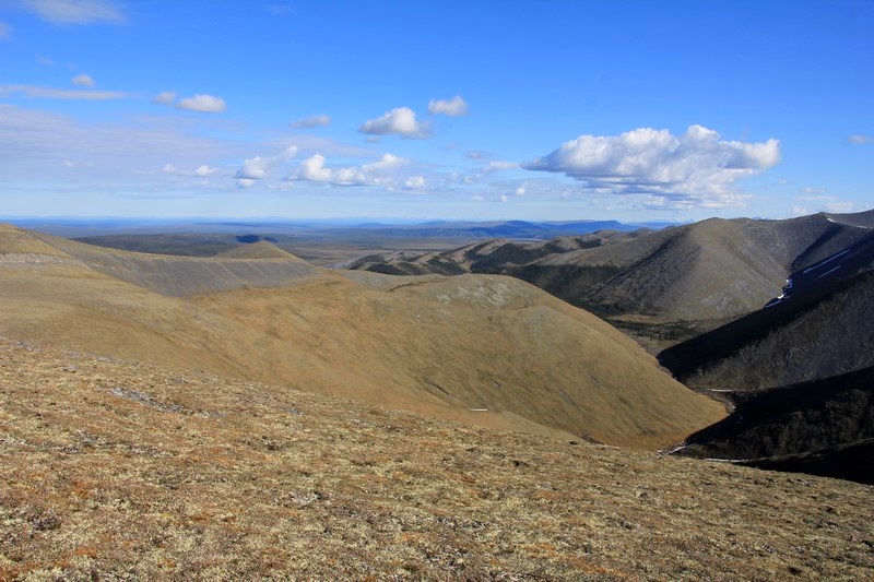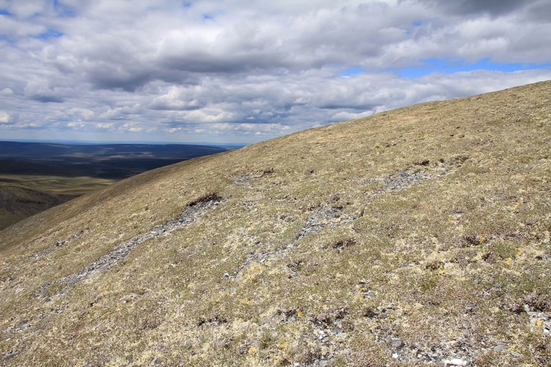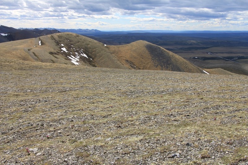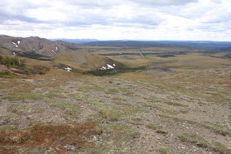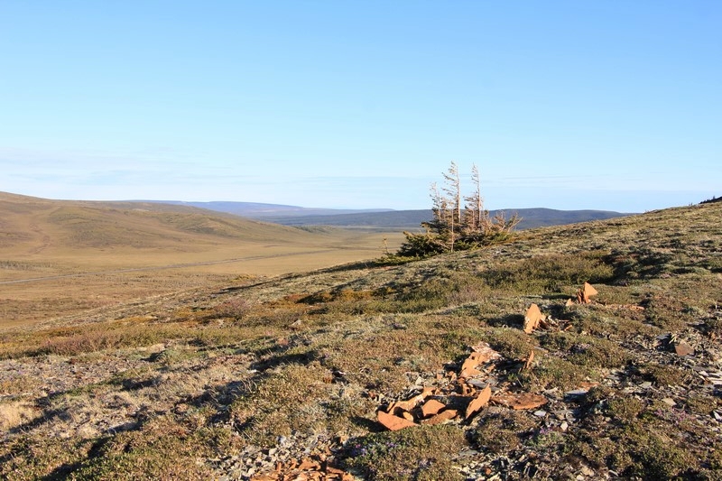 On trouve finalement à se poser quelques km plus loin dans une autre carrière (66.665422,-136.320604) avec une crête qui descend juste à côté, idéale pour aller randonner.