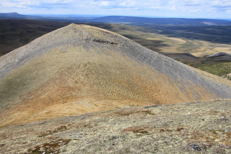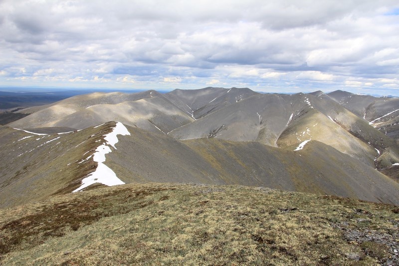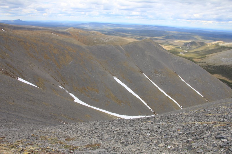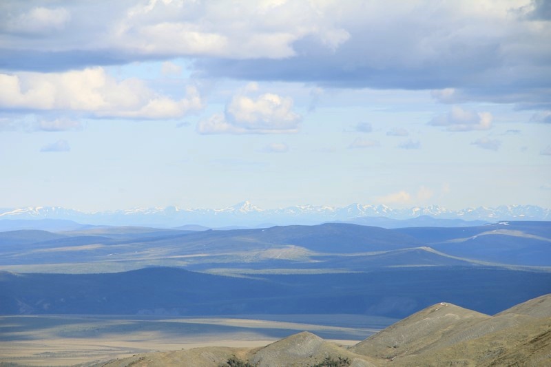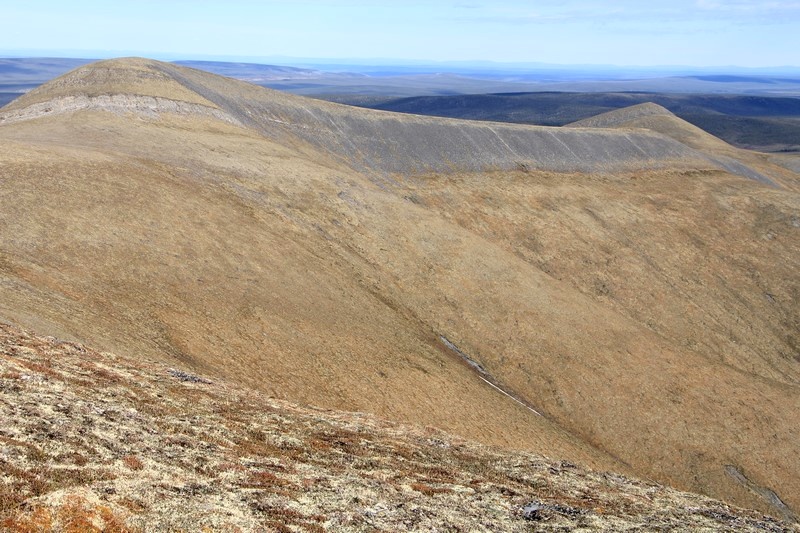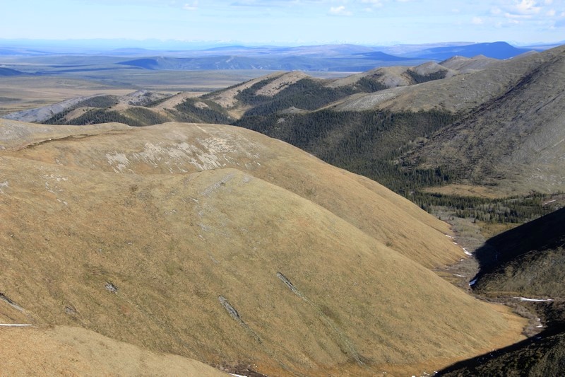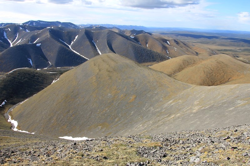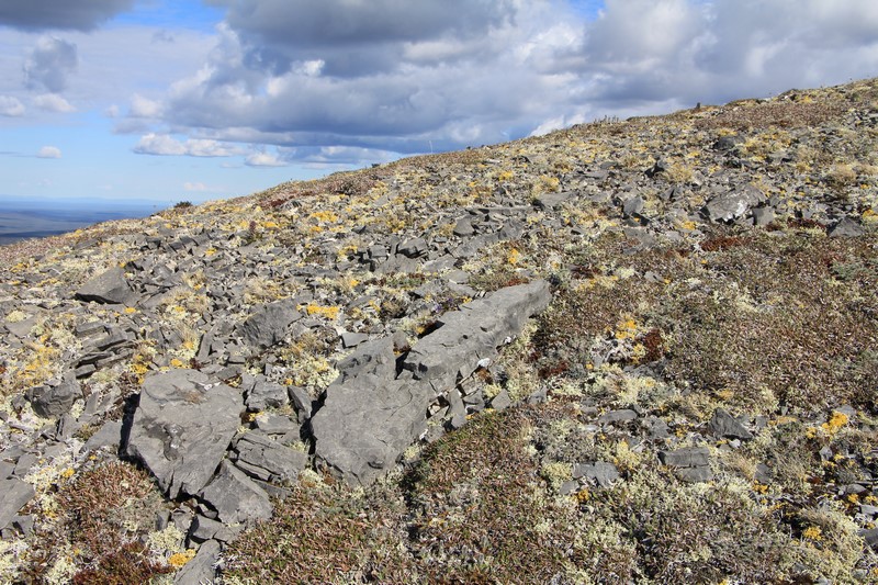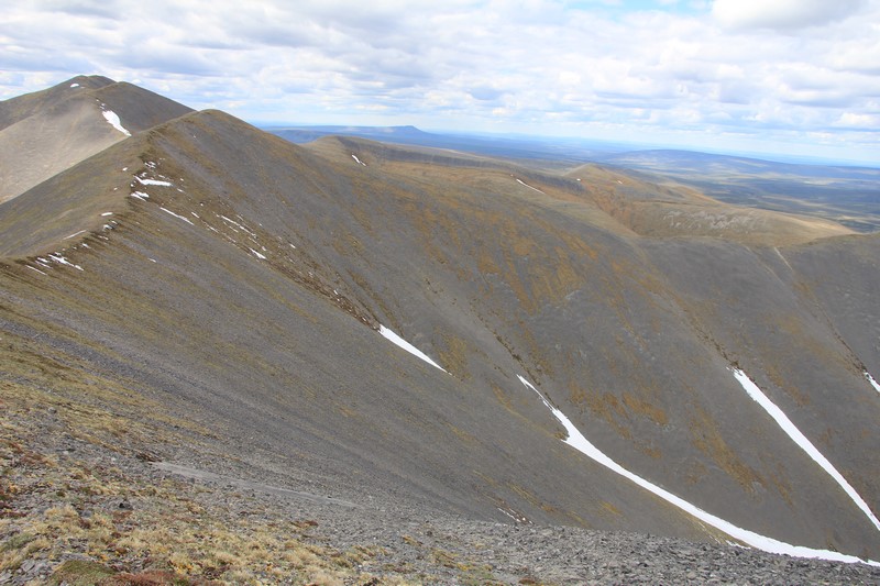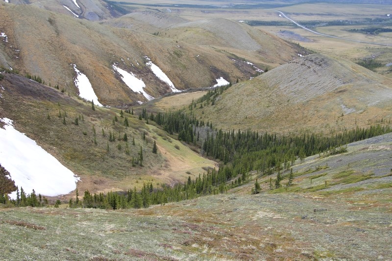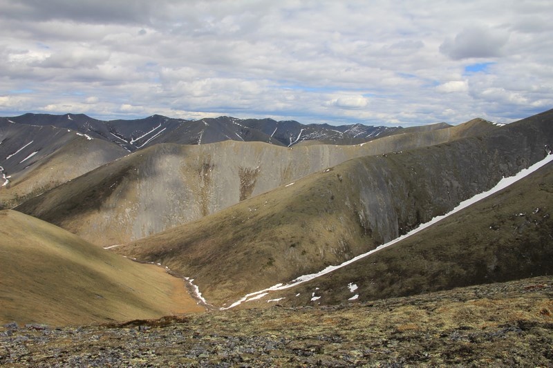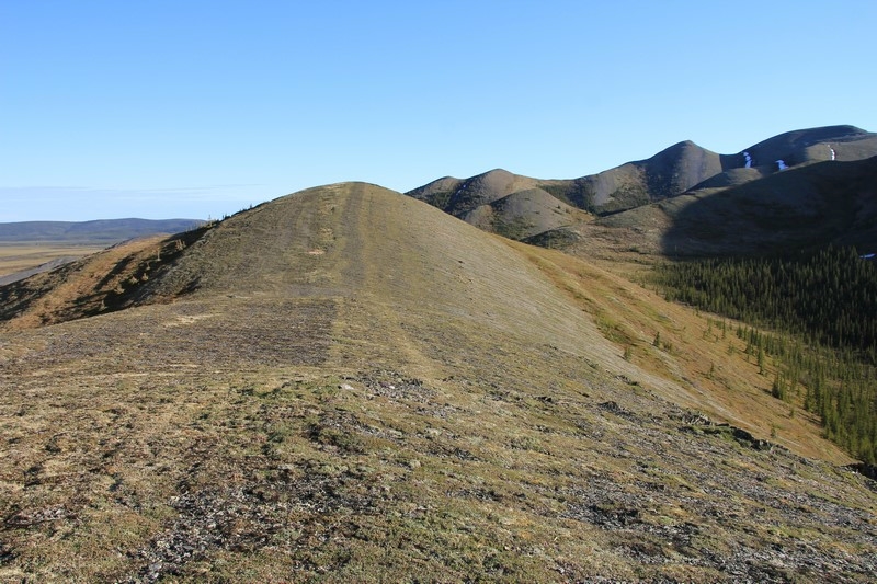 On trouve finalement à se poser quelques km plus loin dans une autre carrière (66.665422,-136.320604) avec une crête qui descend juste à côté, idéale pour aller randonner.