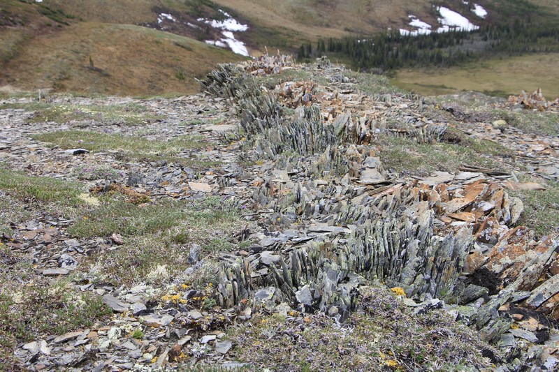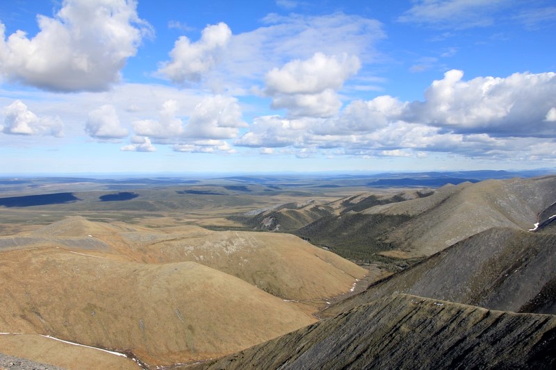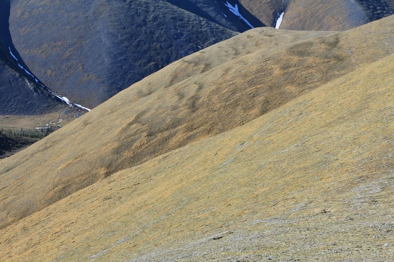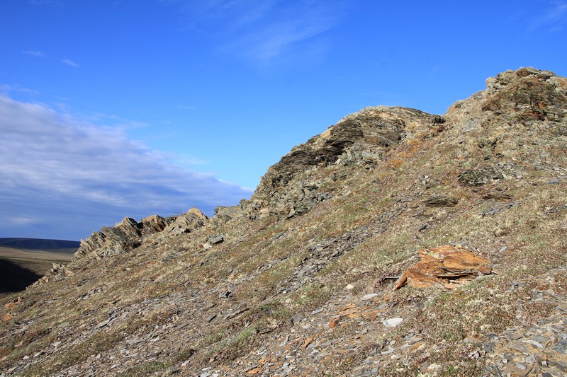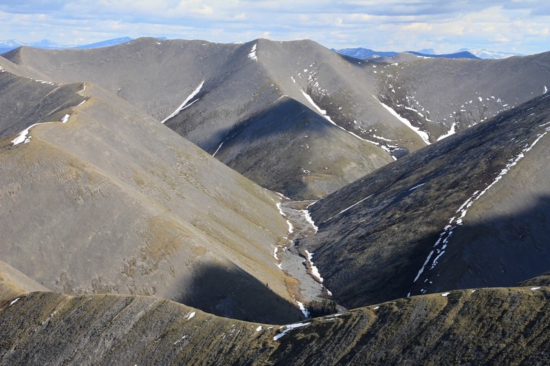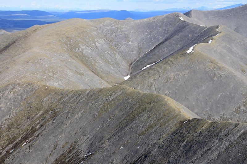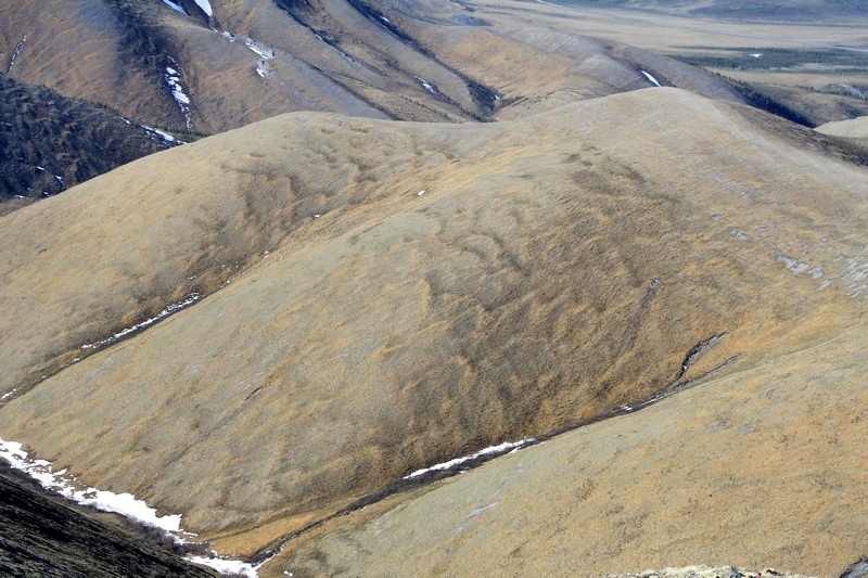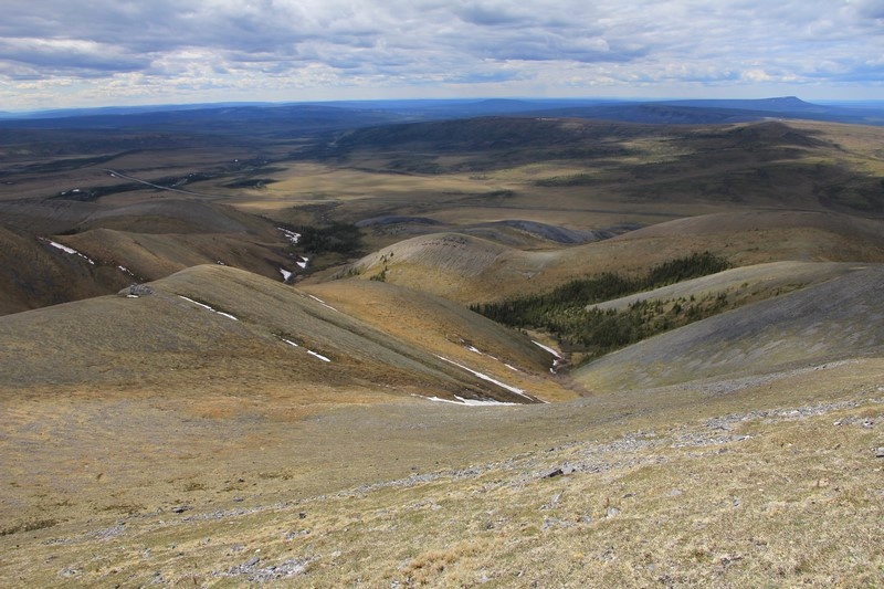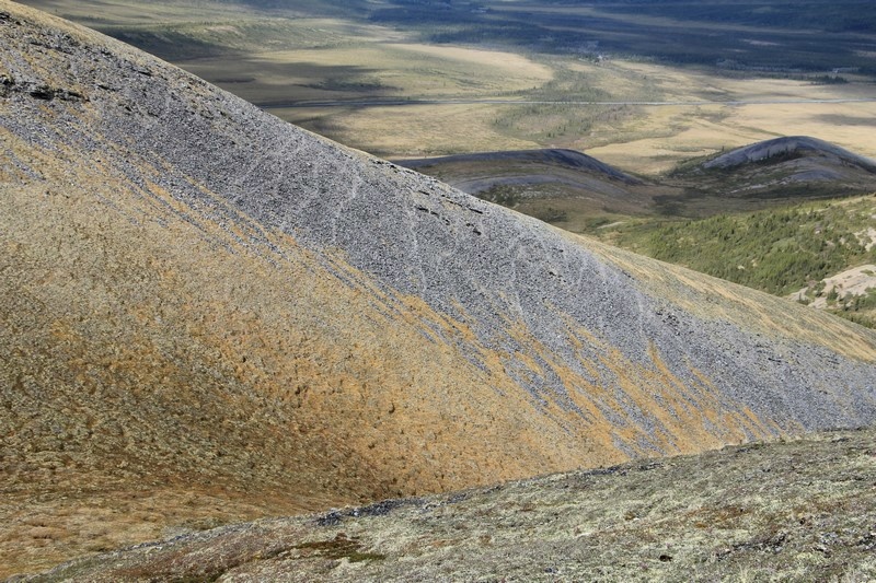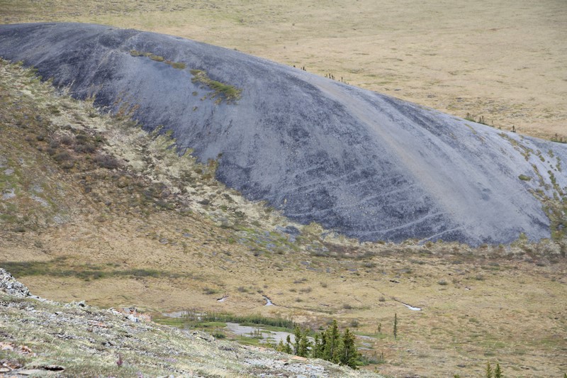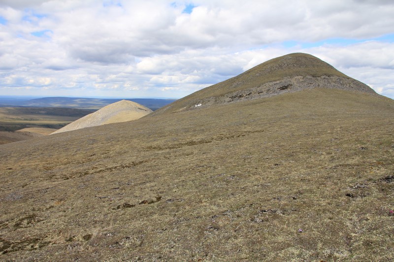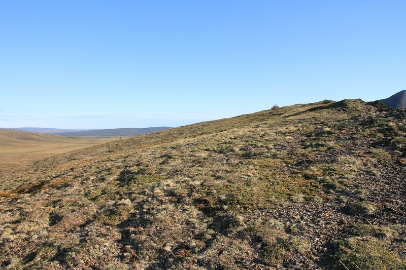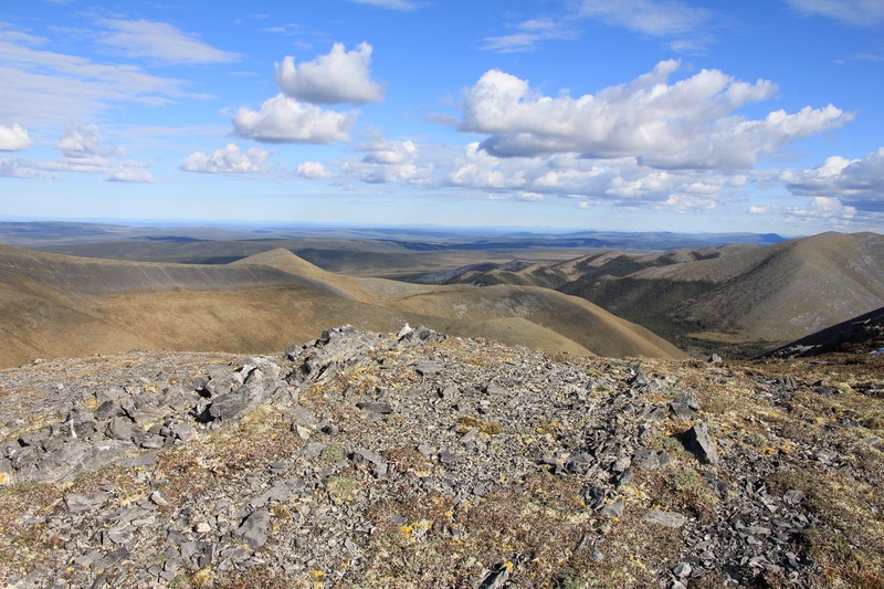 On trouve finalement à se poser quelques km plus loin dans une autre carrière (66.665422,-136.320604) avec une crête qui descend juste à côté, idéale pour aller randonner.