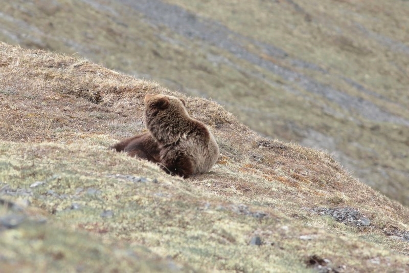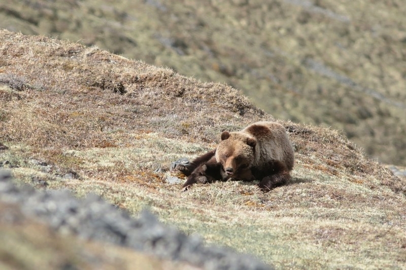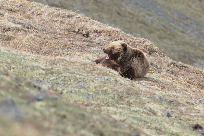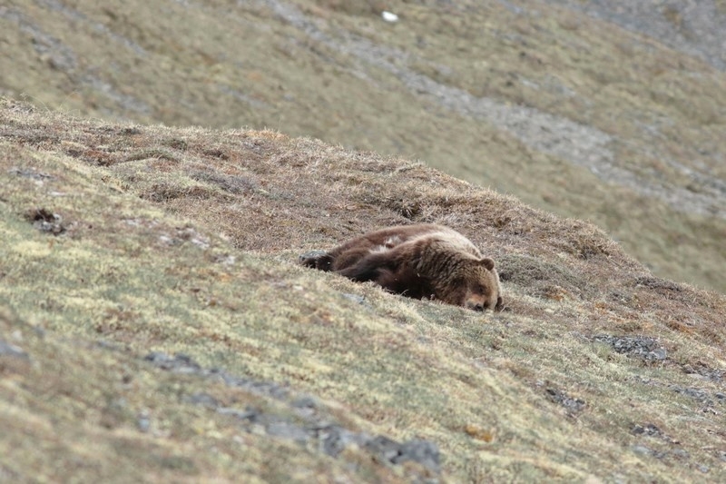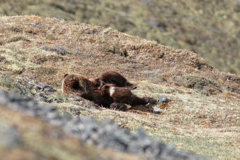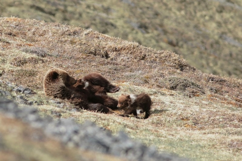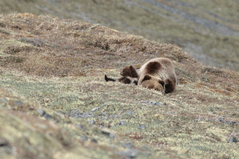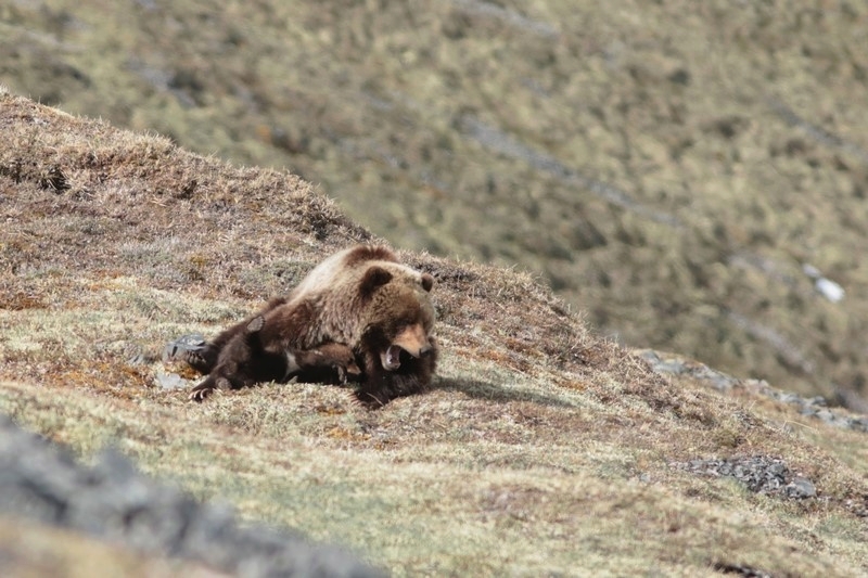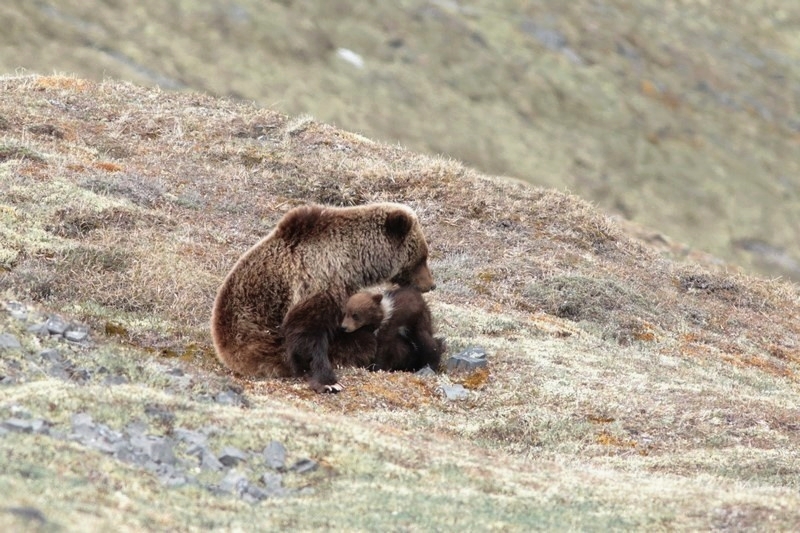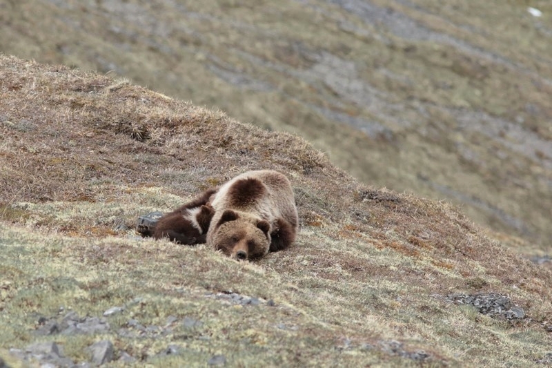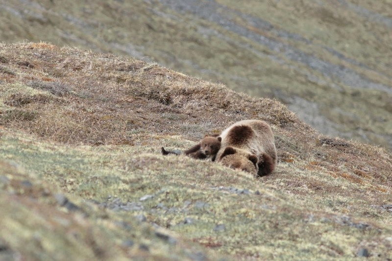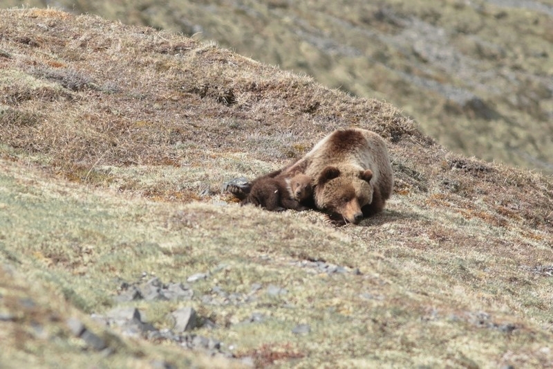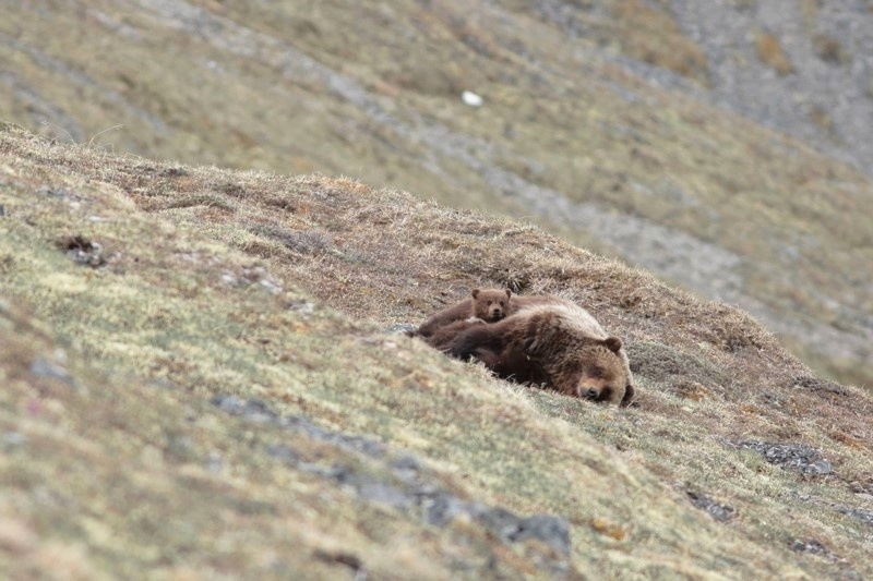 Là, à flanc de colline, une maman grizzly dormait avec ses petits.