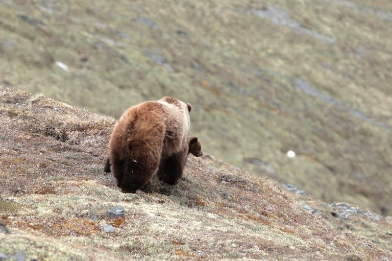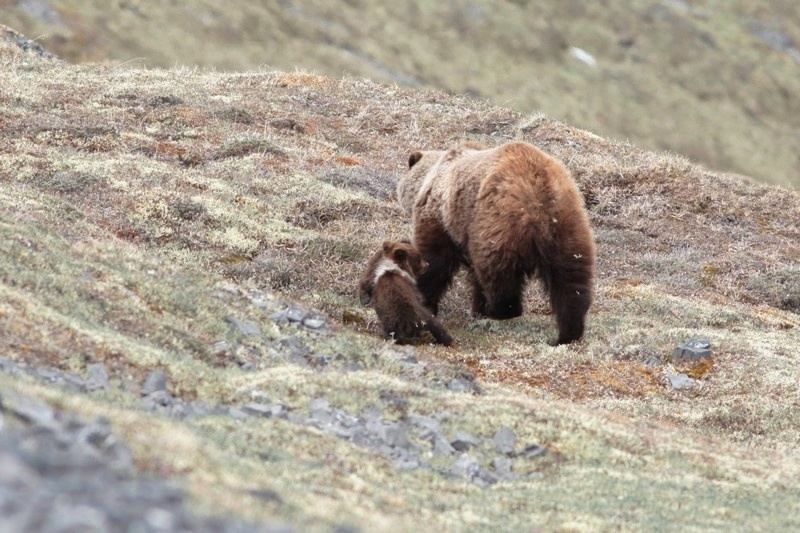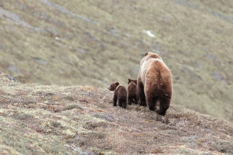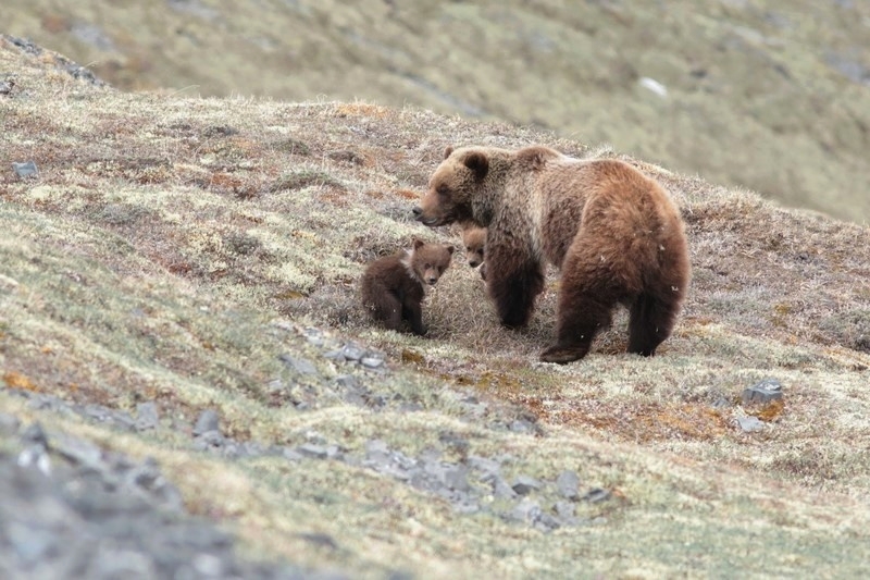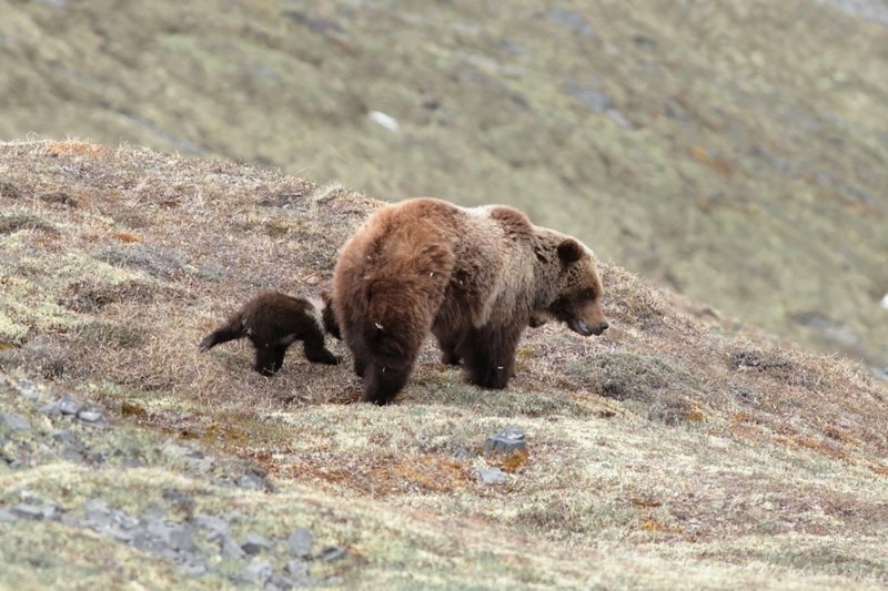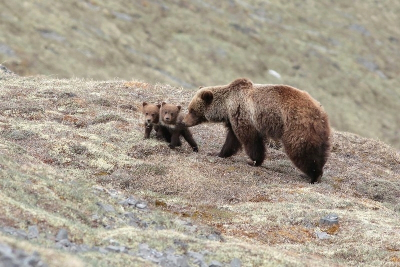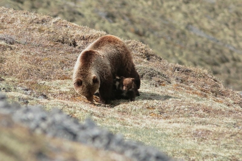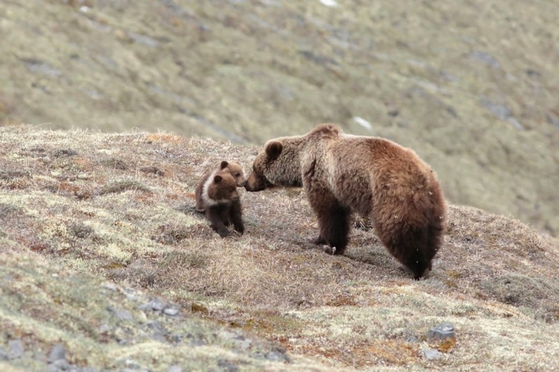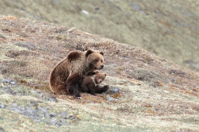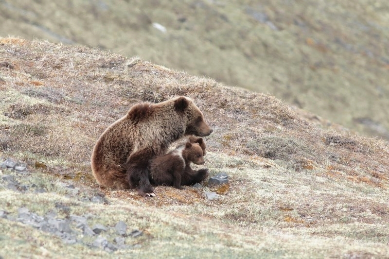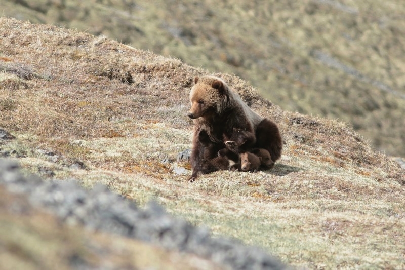Mais lorsque le grizzly s'est réveillé, deux petites têtes ont pointé d'entre ses pattes.