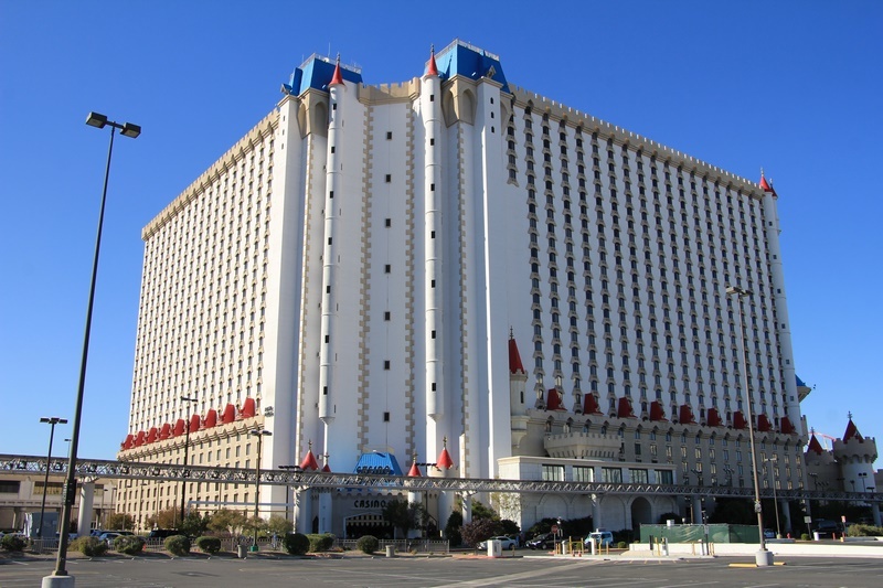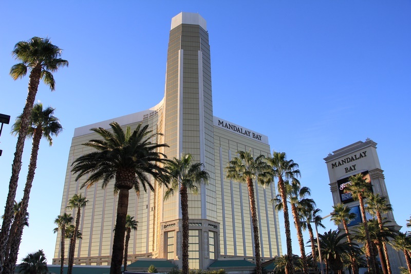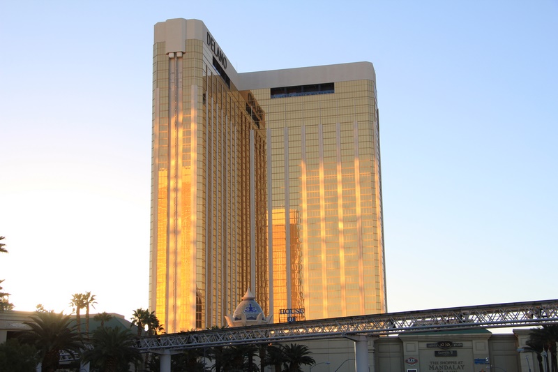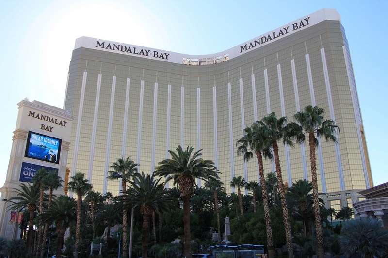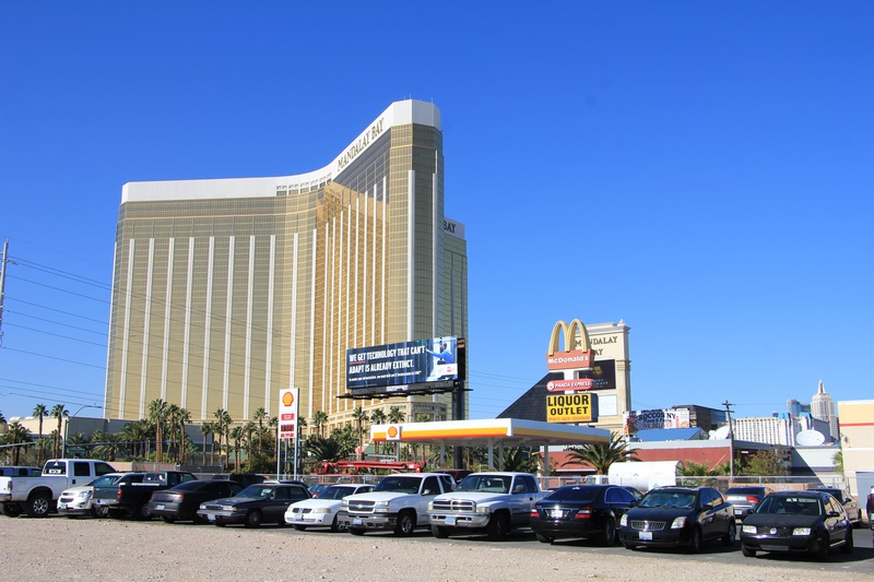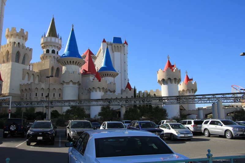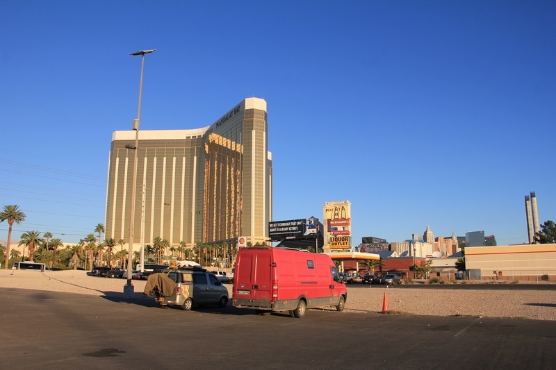 Il y a plusieurs parkings gratuits ou payants pour bivouaquer près du Strip. Sur les conseils de Claude et Marie-Jo, on se gare sur le parking gratuit près de l'aéroport, en face du Mandalay Bay, au sud du Strip (36.088864,-115.171788). Bondé en journée, il ne reste plus que quelques bus et camping-cars la nuit.