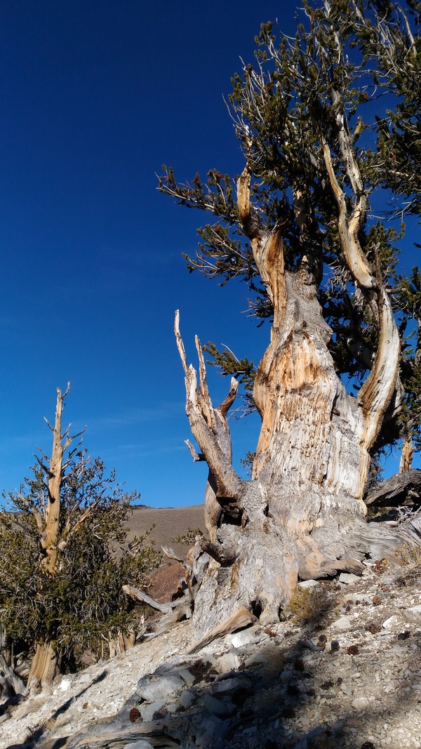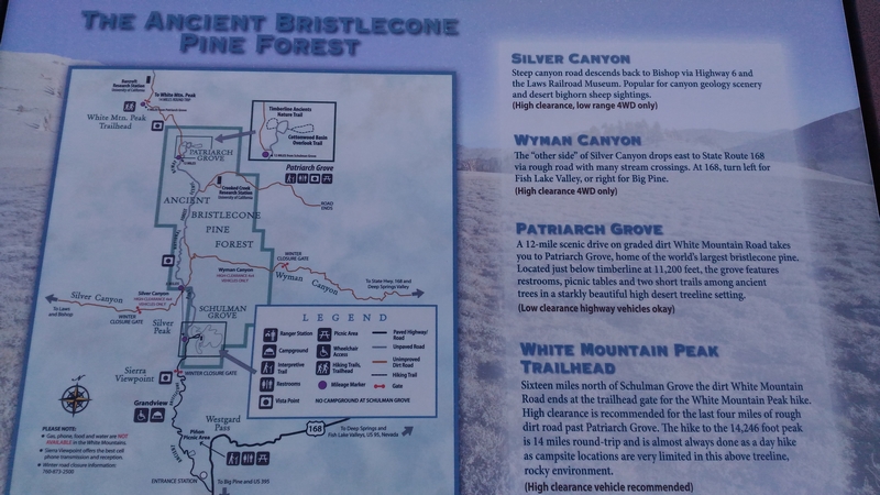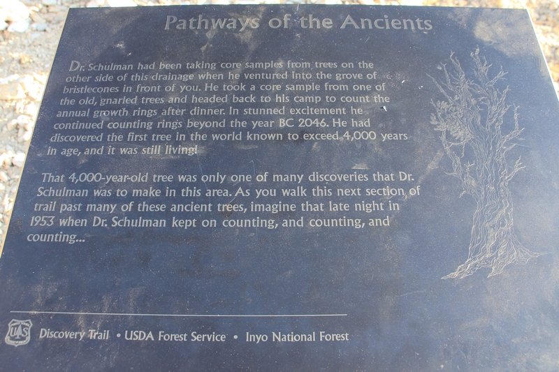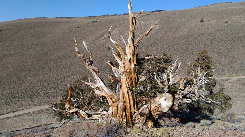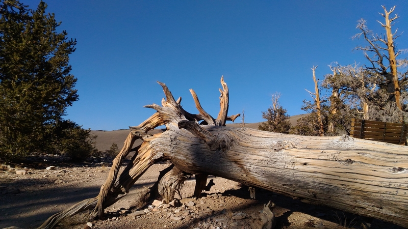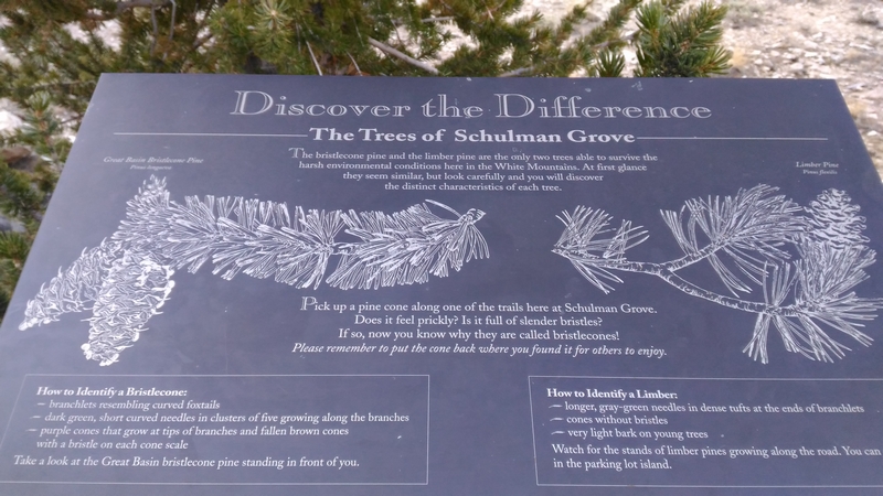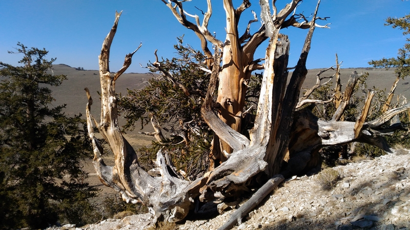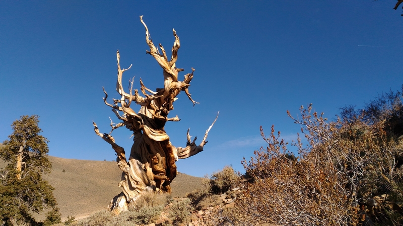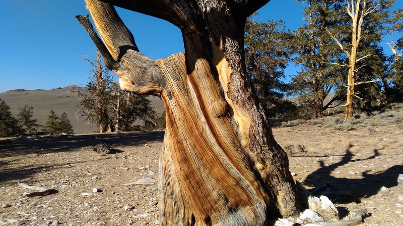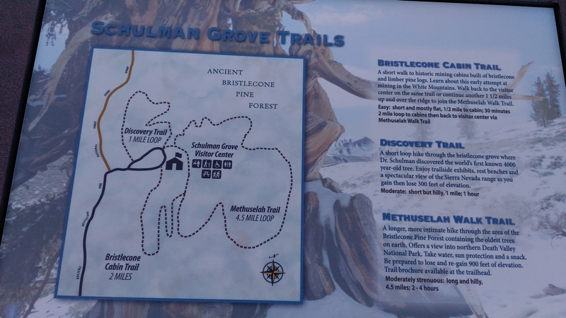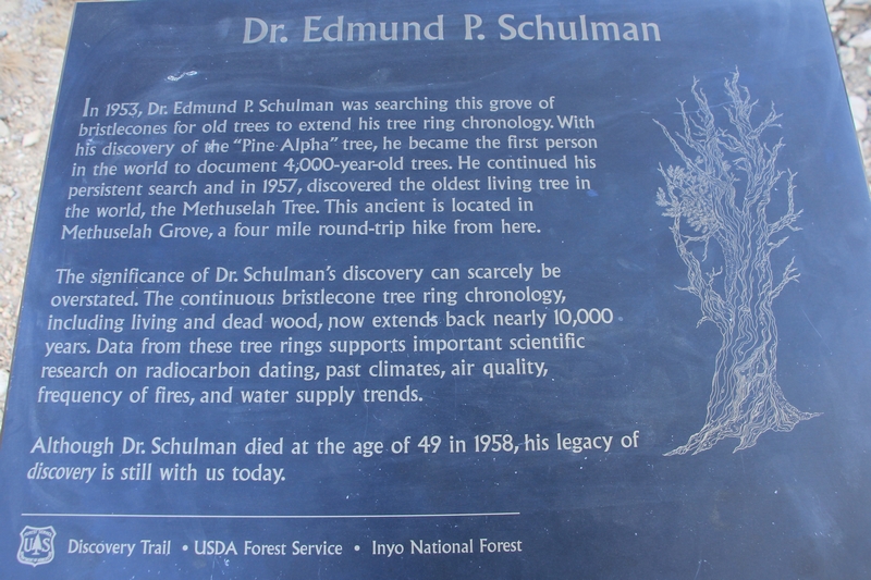 On commence donc par Schulman Grove (37.385579,-118.178962), dédiée au professeur de dendrologie Edmund Schulman qui fut le premier à dater ces arbres et qui identifia le Bristlecone Pine qui est l'arbre le plus vieux du monde, âgé de 4700 ans et surnommé Methuselah.