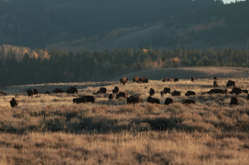Après sa rencontre avec le Buck, Bel Homme s'en va arpenter la prairie à la recherche de la Grouse. Un groupe de bisons paisse au loin.