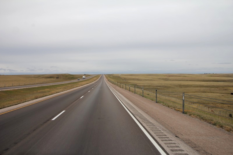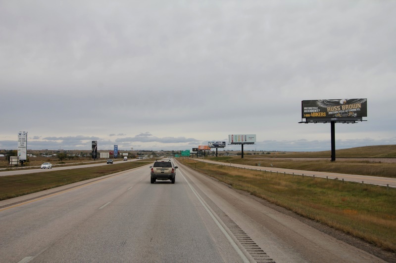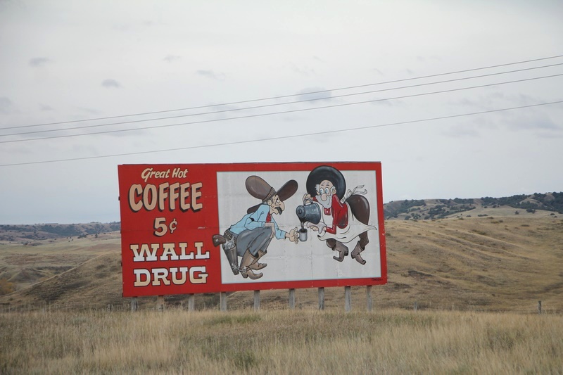 On entre dans le South Dakota afin de déjeuner sur la rest area suivante. Puis on reprend la route avec un paysage toujours identique, ponctué tous les km par des panneaux faisant la pub du village de Wall Drug, soi-disant typiquement western avec un café à 5 cents.
