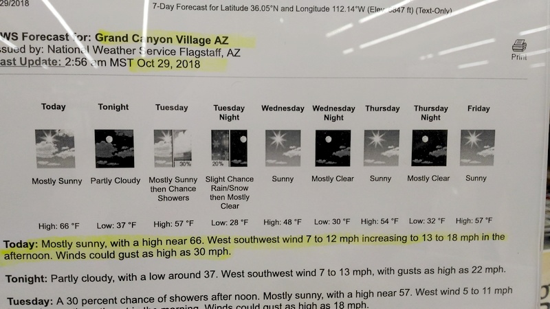 Le parc est blindé de monde. On quitte le village de Grand Canyon après avoir pris les renseignements qu'il nous fallait (rando et météo) pour se poser dans la Kaibab National Forest, cette fois à la sortie sud du parc (35.988335,-112.133753).