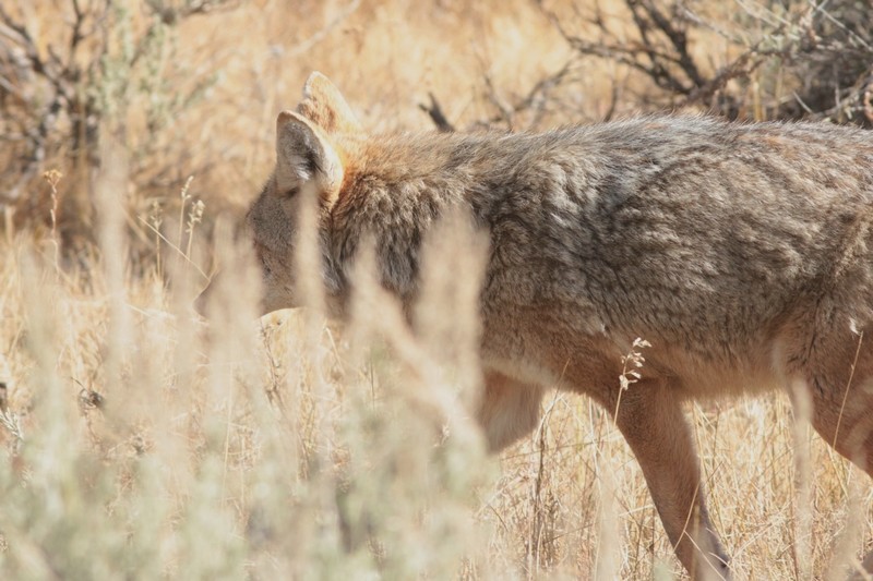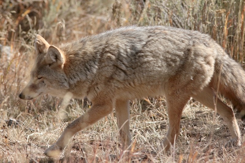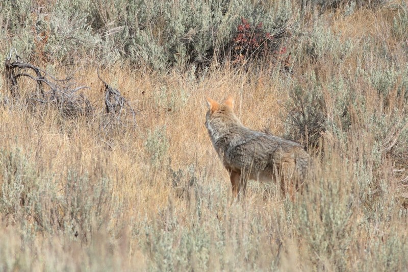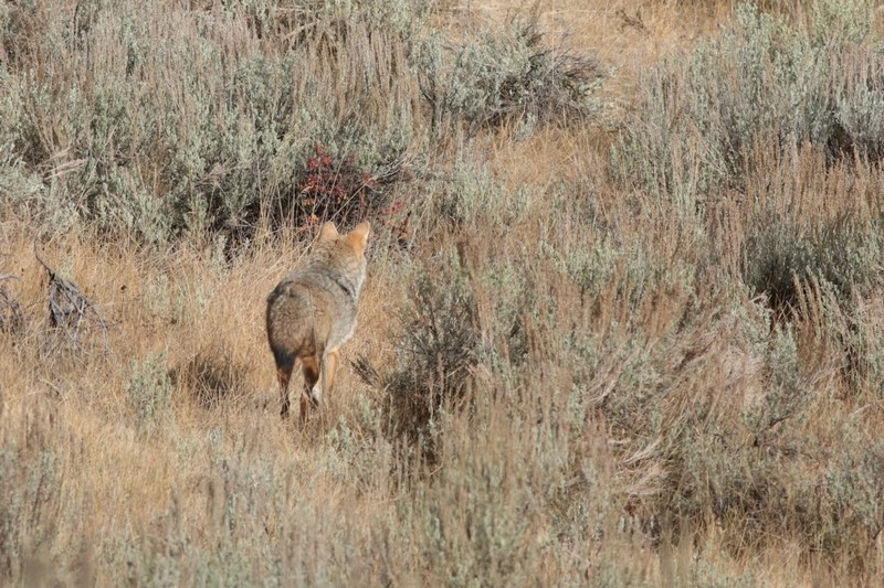 Là, c'est un coyote qui trotte tranquillou dans la prairie et va se rapprocher du bord de la route. Certains américains y verront un loup, mais c'est bien un coyote.
