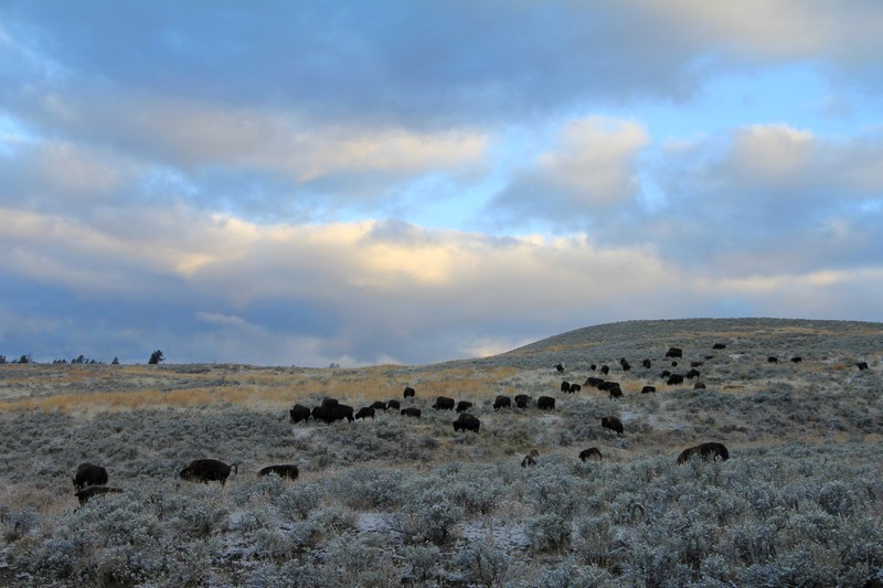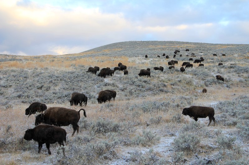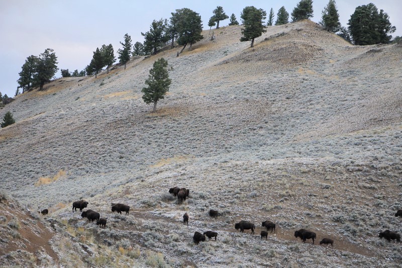 Tout est gelé, ce qui n'empêche pas les bisons de brouter de bon matin.