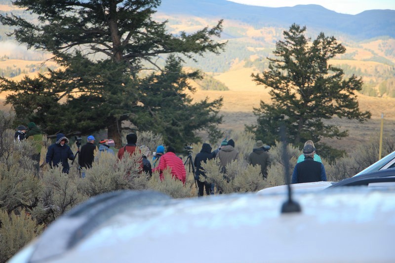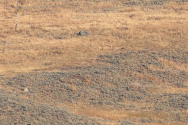 On se pose d'abord en bord de piste vers Slough Creek. Babé sort la longue vue et repère en effet quelques loups. Mais ils sont encore loin. Alors, on reprend la route pour se poser un peu plus près.