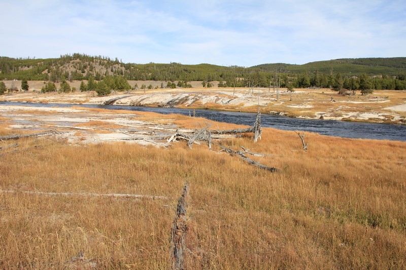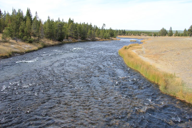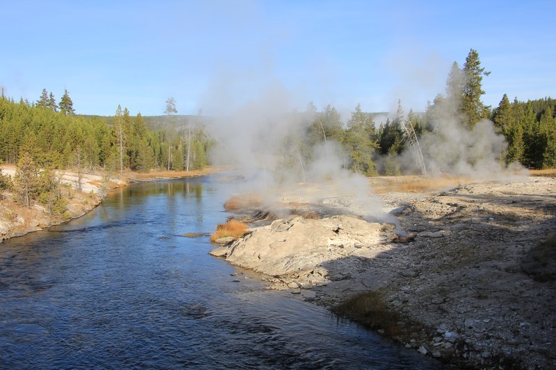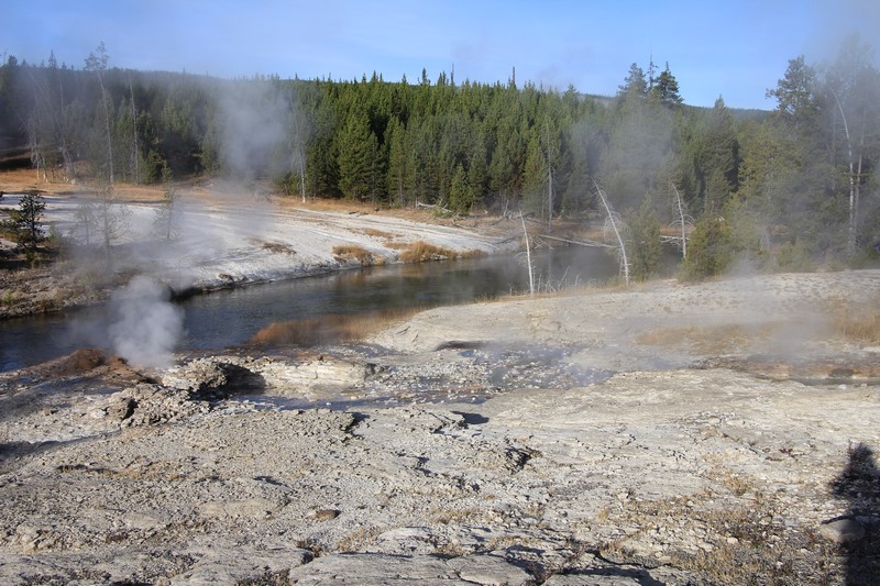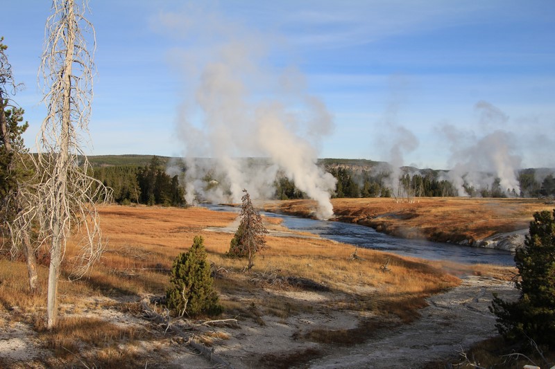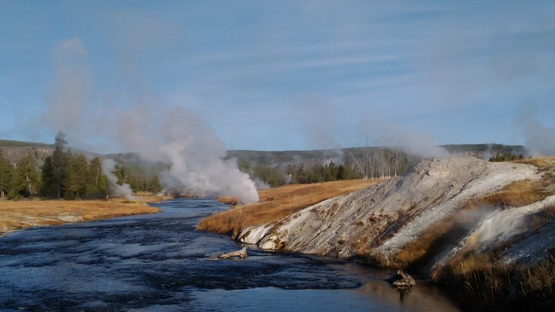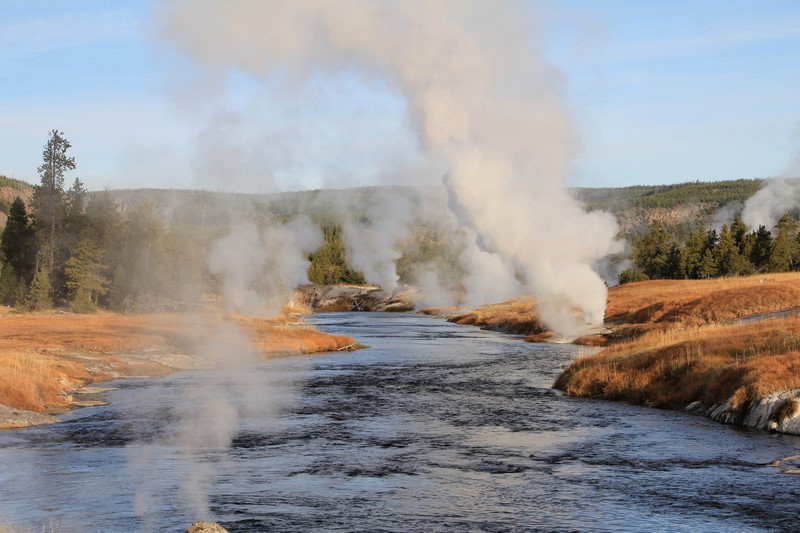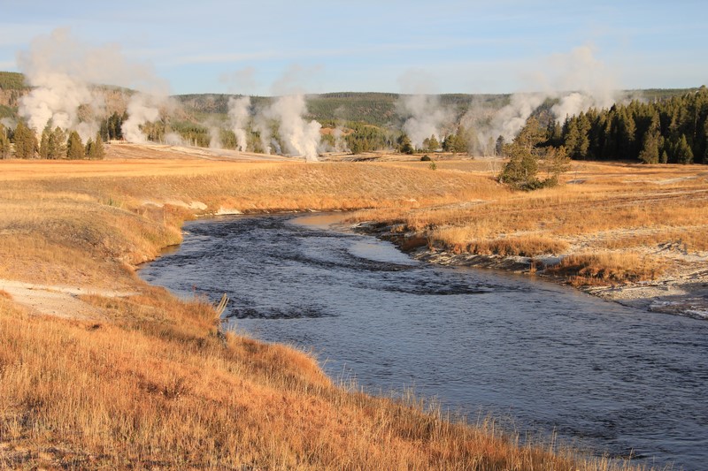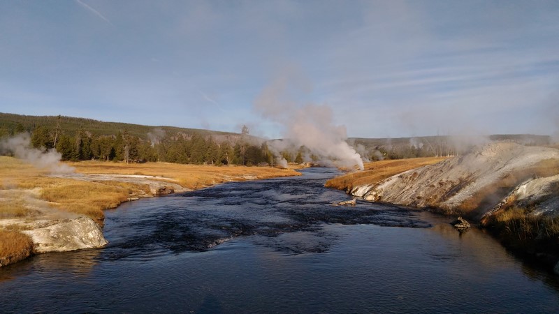 Dans la vallée, des wapitis traversent la rivière. Pas le temps de s'arrêter (de toute façon, il ne fait pas encore assez jour ), on trace directement à Old Faithful.
