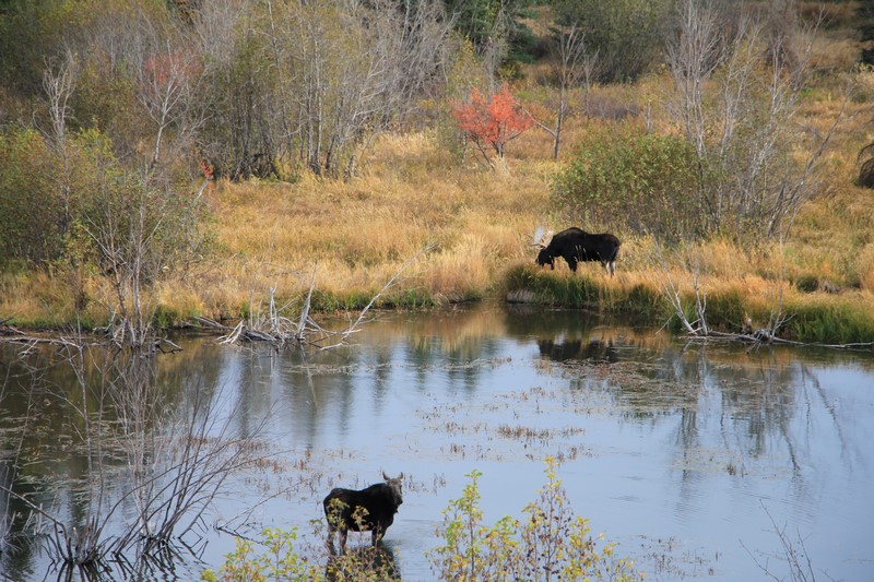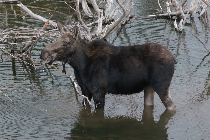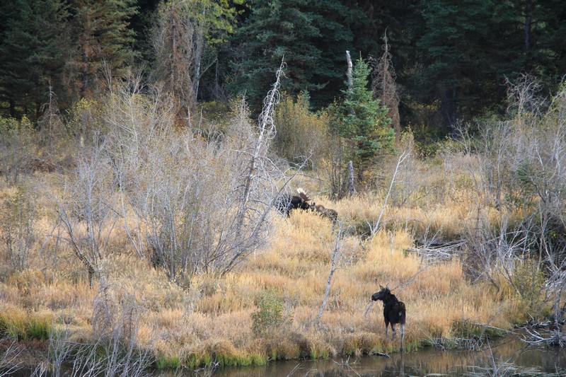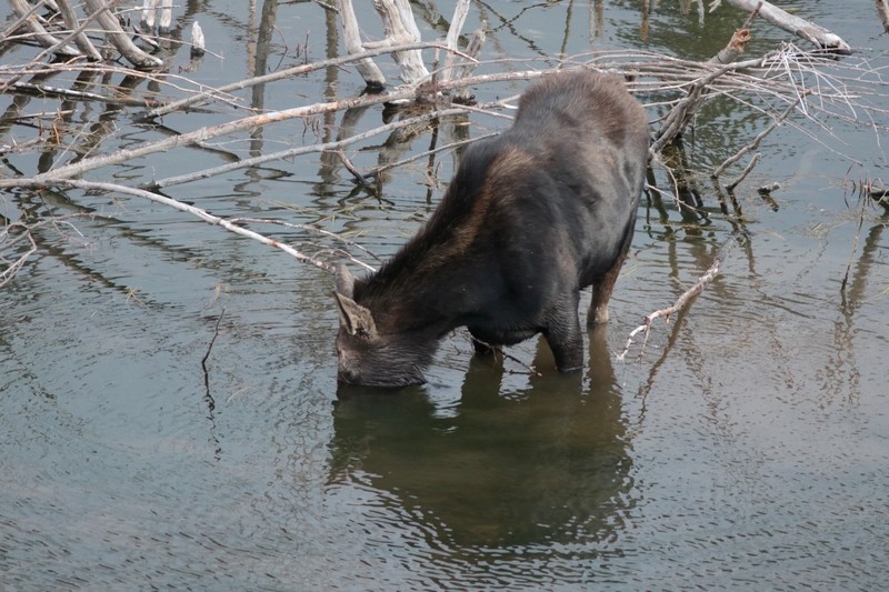 On refait la route en sens inverse et là, c'est une famille d'orignaux (une femelle, son veau et un buck) qui se trouve dans un étang, en contrebas de la route.