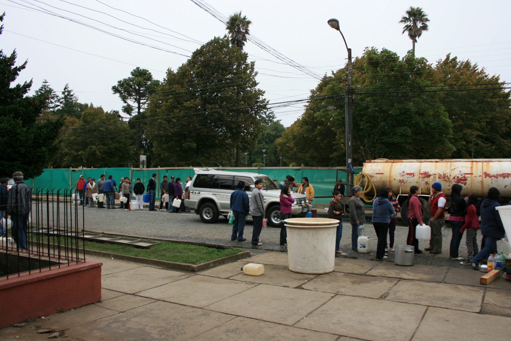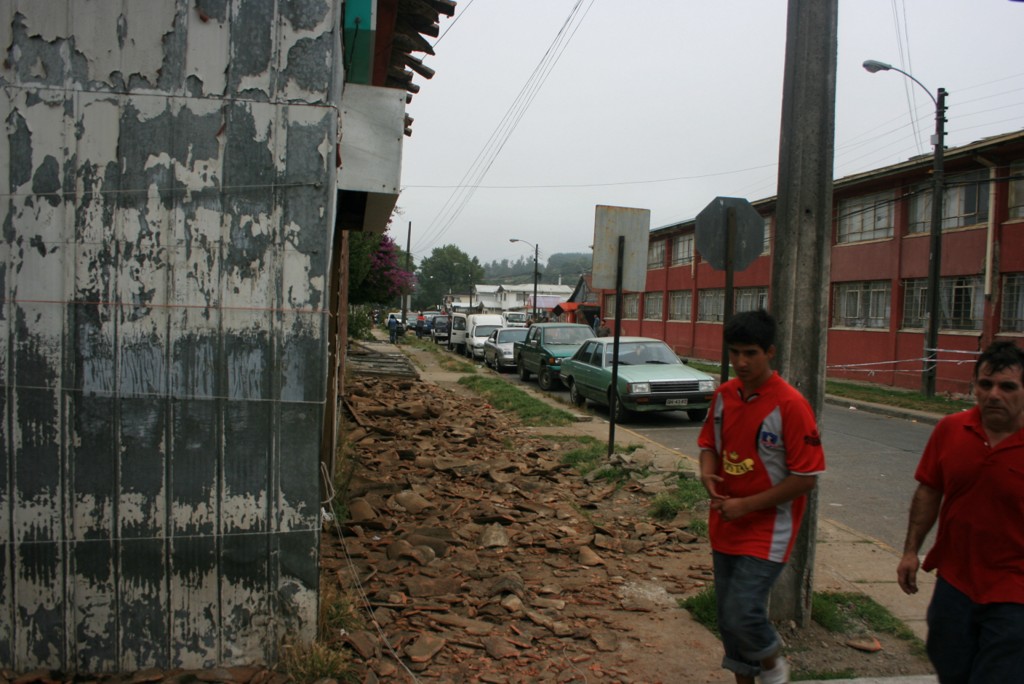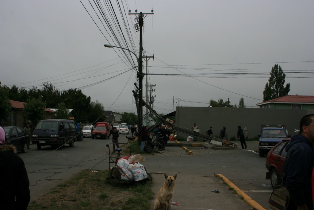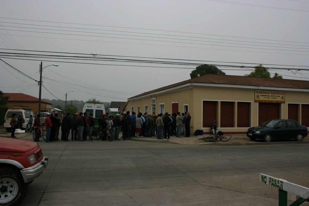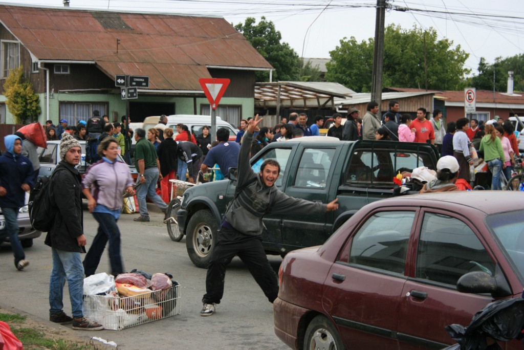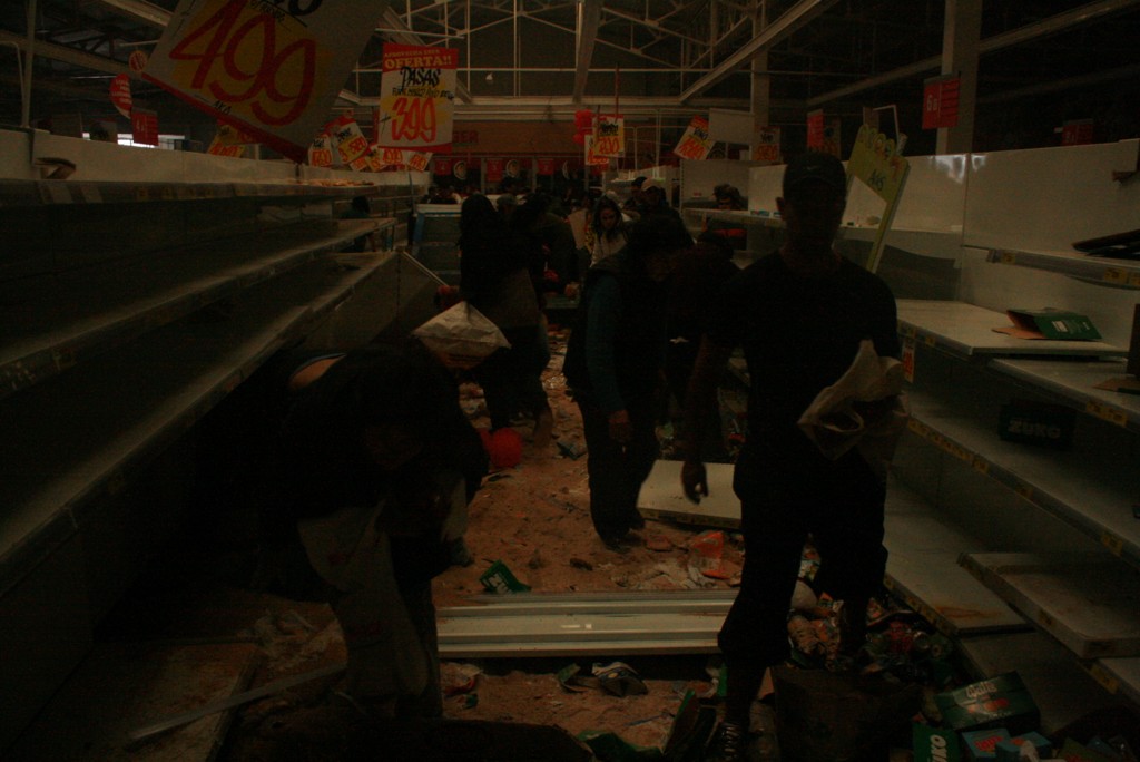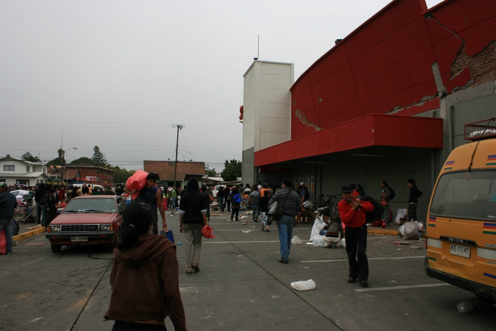 Une fois en ville, on peut oublier les secours… Comme le bas de la ville donne directement sur l’océan, c’est un peu chacun pour soi. Les gens qui ont des pickups les chargent au maximum et se rendent sur les hauteurs ou tentent tout simplement de quitter la ville. Pour ceux qui restent, c’est la recherche d’eau et de nourriture qui prime. Heureusement, il y a un entrepôt de farine et les autorités ont organisé une distribution qui se passe plutôt bien. Pour l’eau même topo, de gros camions citerne ont été réquisitionnés, ils ont puisé directement dans les réservoirs de la ville et distribue maintenant le précieux liquide. Pour le reste, l’abandon de la surveillance du supermarché par les carabineros va faire la joie des locaux. Après quelques tentatives infructueuses pour ouvrir les portes, un gros 4x4 transformé en bélier permet à la foule de se déverser dans les rayons. Encore une fois, c’est chacun pour soi et il ne faudra pas longtemps pour vider le magasin. C’est dommage que les gens ne se soient pas organisés pour tout distribuer calmement car dans la précipitation, des kilos de nourriture ont été gâchés. Le principal est que ça soit passé dans une bonne ambiance.