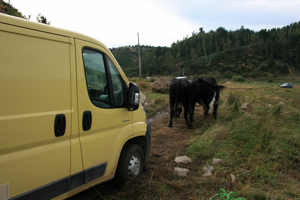 On est réveillés à 5h50 par les chants de la messe, puis avec une grosse réplique supérieure à 6. On transfère TiCamion près du départ de la piste, au cas où, et bien sûr, on s'embourbe. Deux bœufs nous tirent de là.