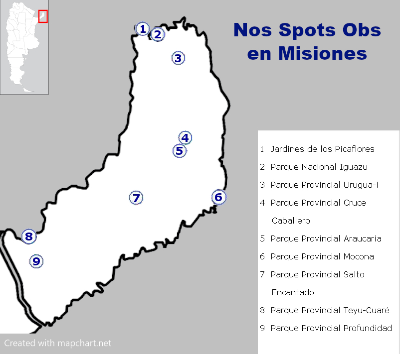 La carte "Nos Spots obs en Misiones" a été réalisé par Lise Coulaud-Dutheil à l'aide d'un fond de carte provenant du site https://mapchart.net/ en conformité avec la license d'utilisation de ce site et de la license Creative Commons Attribution-ShareAlike 4.0 International License (version française de cette license ici : https://creativecommons.org/licenses/by-sa/4.0/deed.fr) à laquel elle est soumise.