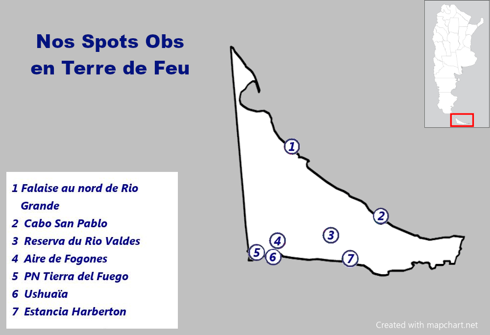 La carte "Nos Spots obs en Terre de Feu" a été réalisé par Lise Coulaud-Dutheil à l'aide d'un fond de carte provenant du site https://mapchart.net/ en conformité avec la license d'utilisation de ce site et de la license Creative Commons Attribution-ShareAlike 4.0 International License (version française de cette license ici : https://creativecommons.org/licenses/by-sa/4.0/deed.fr) à laquel elle est soumise.