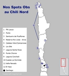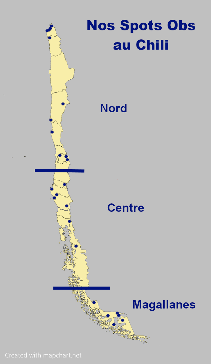 La carte "Nos Spots Obs au Chili" a été réalisé par Lise Coulaud-Dutheil à l'aide d'un fond de carte provenant du site https://mapchart.net/ en conformité avec la license d'utilisation de ce site et de la license Creative Commons Attribution-ShareAlike 4.0 International License (version française de cette license ici : https://creativecommons.org/licenses/by-sa/4.0/deed.fr) à laquel elle est soumise.